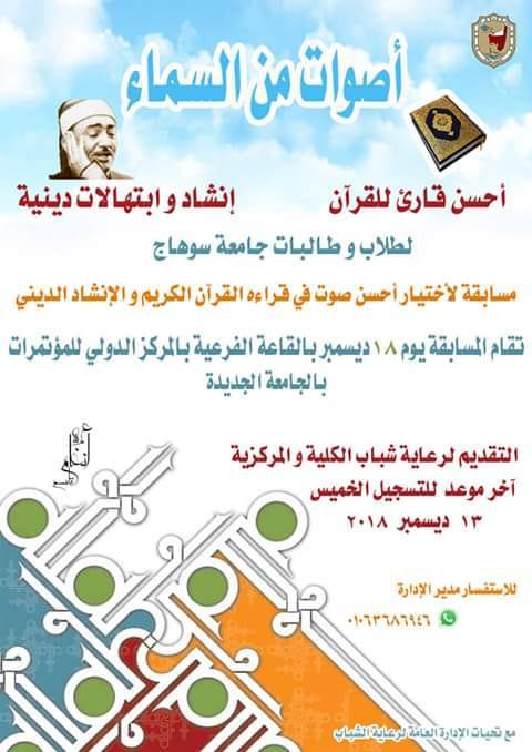 تنظم الإدارة العامة لرعاية الشباب المركزية بجامعة سوهاج، يوم 18 ديسمبر الجاري، مسابقة بعنوان “أصوات من السماء” لاختيار أحسن قارئ للقرآن، وأفضل إنشاد وابتهالات دينية، وذلك لطلاب وطالبات الجامعة من مختلف الكليات، صرح بذلك أ.د/ أحمد عزيز – رئيس الجامعة أن الجامعة تهتم بتنظيم العديد من المسابقات الدينية المتعلقة بالقرآن الكريم، والتي تسعى لتحفيز الطلاب على الإقبال أكثر على معرفة أحكام القرآن الكريم وتعليمه، وتلاوته بالكيفية الصحيحة مع حسن الأداء، بالإضافة إلى الأحاديث النبوية والسيرة المحمدية.