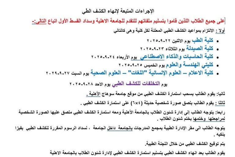 *جامعة سوهاج الأهلية تعلن مواعيد الكشف الطبي للطلاب الجدد* تعلن جامعة سوهاج الأهلية برئاسة الدكتور حسان النعماني رئيس الجامعة، عن مواعيد توقيع الكشف الطبي على الطلاب الجدد المقبولين بكلياتها للعام...