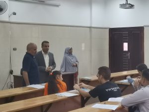 الدراسات العليا والبحث العلمي وا.د منصور ابو كامل مشرف عام الامتحانات العملية الامتحانية واطمئن على حسن سيرها بجميع اللجان مشيدا بالتنظيم والالتزام من جميع منتسبي كلية الألسن على المستوى الاكاديمي والإداري والطلا يث بي.