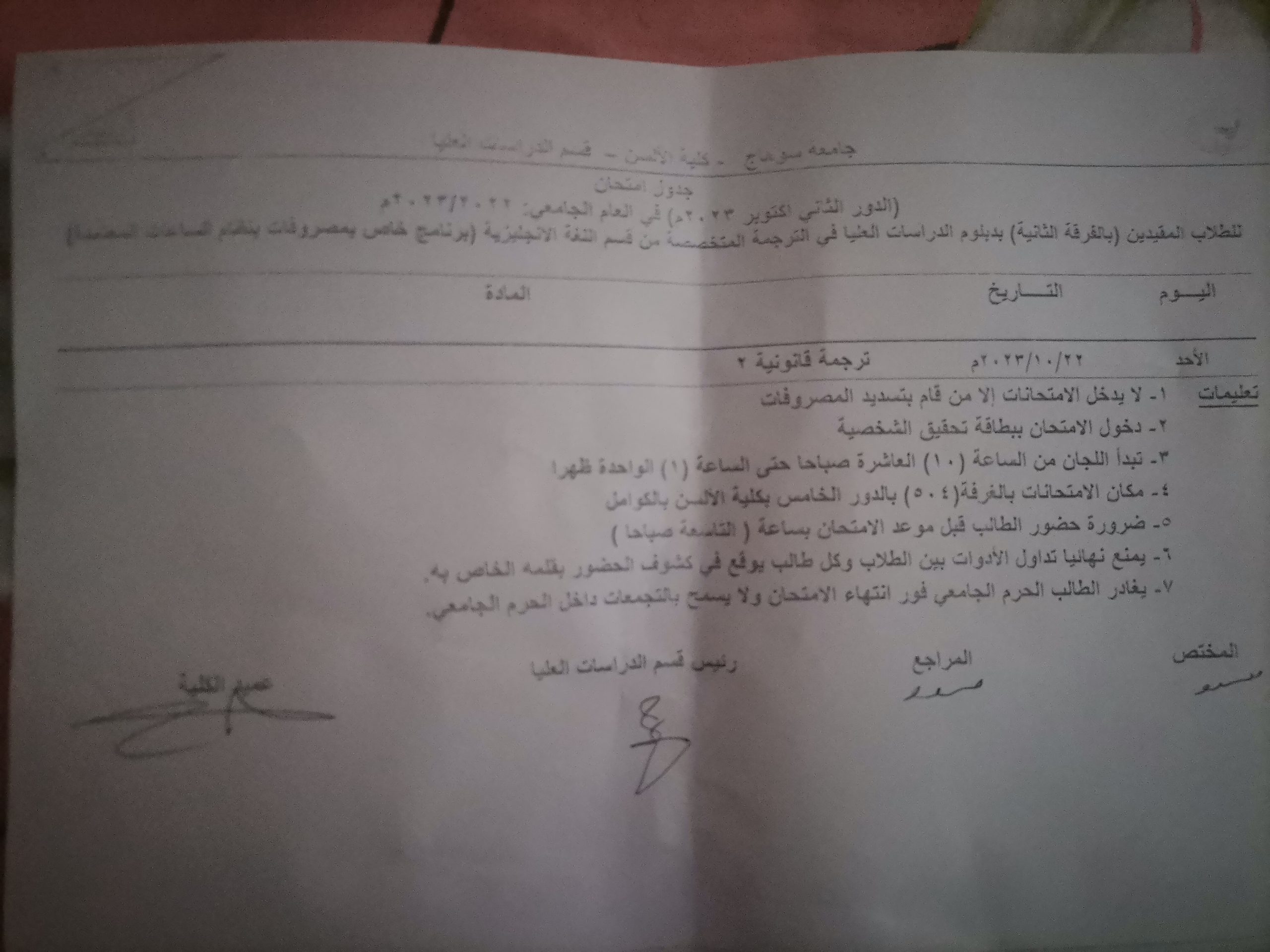 بواسطة Nourنشر على 17 أكتوبر، 2023نشر في اخر الاخبار جدول إمتحان الدور الثاني أكتوبر 2023 م لطلاب الفرقة الثانية المقيدين دبلومة الترجمة المتخصصة قسم اللغة الإنجليزية يوم الأحد الموافق 22 /10 /2023 ترجمه قانونيه تصفّح المقالات جدول إمتحان الدور الثاني أكتوبر 2023 م لطلاب الفرقة الثانية المقيدين دبلومة الترجمة المتخصصة قسم اللغة الإنجليزية يوم الأحد الموافق 22 /10 /2023 ترجمه قانونيهالطلاب االراسبون في الفرقة الأولى يعني اللي عايدين سنه أولى بسبب الرسوب او الغياب وكذلك الطلاب الذين لديهم تخلف من سنه اولى في مقرر اللياقة البدنيه عليهم الذهاب إلى ملاعب كلية التربية الرياضية يوم الخميس القادم في ملاعب كلية التربية الرياضية بالجامعة القديمة بجوار المدينه الجامعية للبنات بحري مستشفى الجامعة