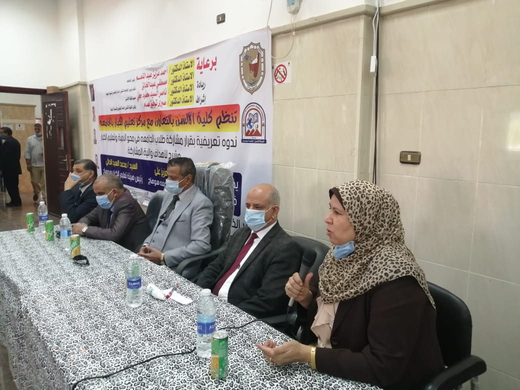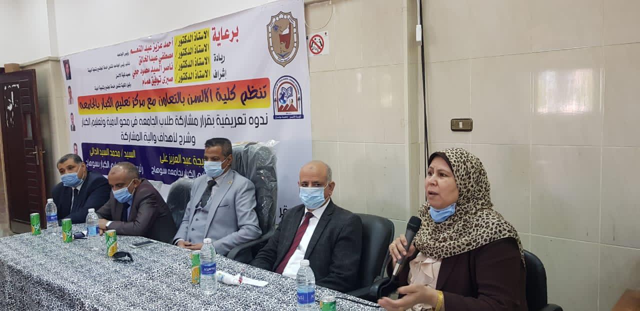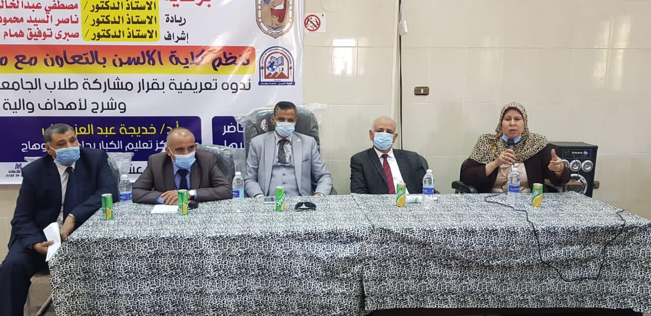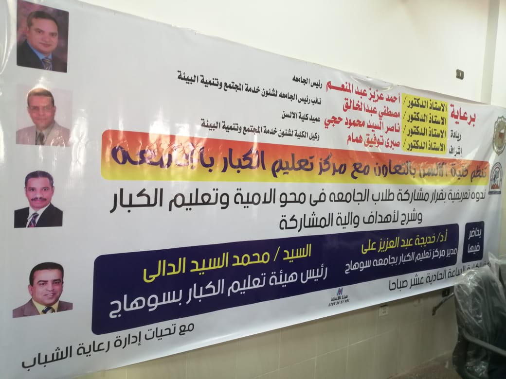 عقدت يوم الأحد الموافق 29/11/2020 فى تمام الساعة الحادية عشرة صباحا ندوة تعريفية بقرار مشاركة طلاب الجامعة في محو الأمية وتعليم الكبار في محافظة سوهاج وذلك بمدرج كلية الألسن الدور الأرضي ، وذلك تحت رعاية معالي الوزير الأستاذ الدكتور أحمد عزيز رئيس الجامعة ومعالي الأستاذ الدكتور مصطفى عبد الخالق نائب رئيس الجامعة لشئون خدمة المجتمع وتنمية البيئة وسعادة الأستاذ الدكتور ناصر السيد حجي عميد كلية الألسن ، وشرف الندوة بالحضور سعادة الأستاذ الدكتور بهاء الدين محمد مزيد وكيل كلية الألسن لشؤؤن الدراسات العليا والبحوث ،و سعادة الأستاذ الدكتور حمادى عبد الحميد وكيل كلية الألسن لشئون الطلاب والتعليم و لفيف من السادة أعضاء هيئة التدريس بالكلية وعدد كبير من طلاب الكلية، وقد أقيمت الندوة بالتعاون بين مركز تعليم الكبار بالجامعة وهيئة تعليم الكبار بالمحافظة و بمشاركة فعالة ومتميزة من الأستاذة الدكتورة خديجة عبد العزيز على….. مدير مركز تعليم الكبار بجامعة سوهاج … والأستاذ محمد السيد الدالى … رئيس هيئة عليم الكبار بسوهاج…. حيث تفضل كل منهما بتوضيح الأهداف المرجوة من مشاركة الطلاب فى تعليم الكبار والية تنفيذ هذه الخطوة وكيفية تفعيلها على أرض الواقع.