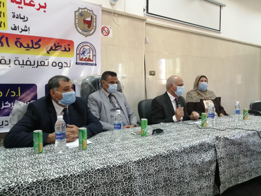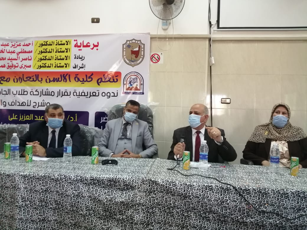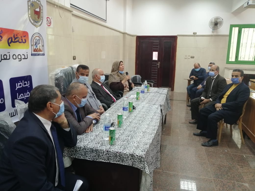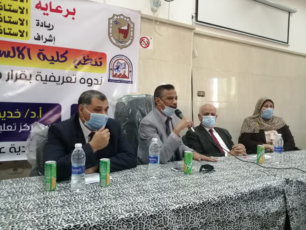 عقدت يوم الأحد الموافق 29/11/2020 فى تمام الساعة الحادية عشرة صباحا ندوة تعريفية بقرار مشاركة طلاب الجامعة في محو الأمية وتعليم الكبار في محافظة سوهاج وذلك بمدرج كلية الألسن الدور الأرضي ، وذلك تحت رعاية معالي الوزير الأستاذ الدكتور أحمد عزيز رئيس الجامعة ومعالي الأستاذ الدكتور مصطفى عبد الخالق نائب رئيس الجامعة لشئون خدمة المجتمع وتنمية البيئة وسعادة الأستاذ الدكتور ناصر السيد حجي عميد كلية الألسن ، وشرف الندوة بالحضور سعادة الأستاذ الدكتور بهاء الدين محمد مزيد وكيل كلية الألسن لشؤؤن الدراسات العليا والبحوث ،و سعادة الأستاذ الدكتور حمادى عبد الحميد وكيل كلية الألسن لشئون الطلاب والتعليم و لفيف من السادة أعضاء هيئة التدريس بالكلية وعدد كبير من طلاب الكلية، وقد أقيمت الندوة بالتعاون بين مركز تعليم الكبار بالجامعة وهيئة تعليم الكبار بالمحافظة و بمشاركة فعالة ومتميزة من الأستاذة الدكتورة خديجة عبد العزيز على….. مدير مركز تعليم الكبار بجامعة سوهاج … والأستاذ محمد السيد الدالى … رئيس هيئة عليم الكبار بسوهاج…. حيث تفضل كل منهما بتوضيح الأهداف المرجوة من مشاركة الطلاب فى تعليم الكبار والية تنفيذ هذه الخطوة وكيفية تفعيلها على أرض الواقع.
