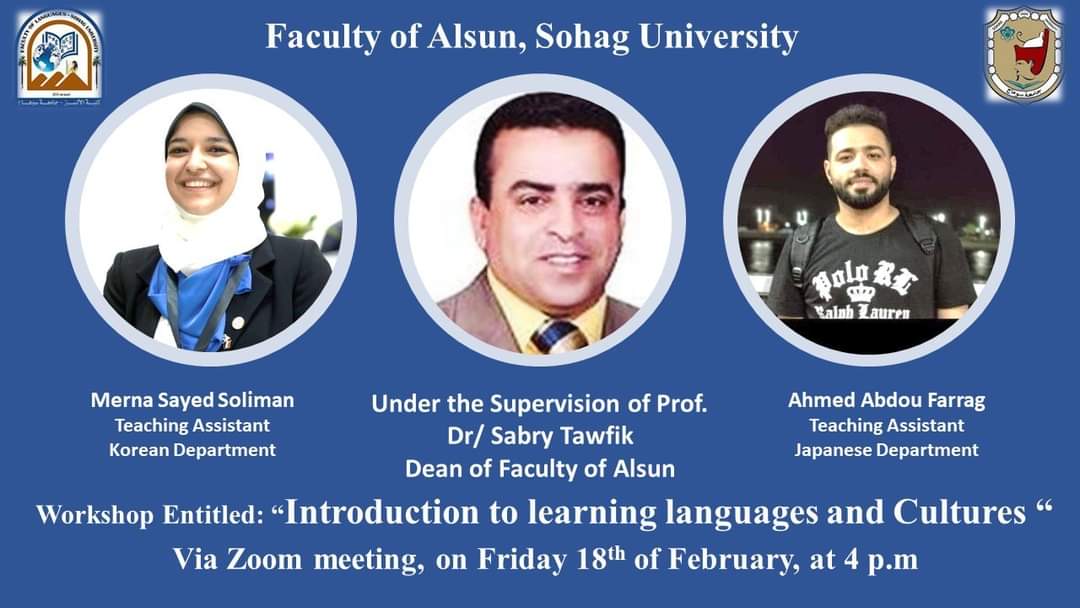 تحت رعاية كريمة من معالي الوزير الأستاذ الدكتور/مصطفي عبد الخالق رئيس جامعة سوهاج، والأستاذ الدكتور /صبري توفيق همام عميد كلية الألسن، يشرفنا حضوركم جميعًا يوم الجمعة القادمة الساعة 4مساءً على منصة “Zoom”؛ لحضور ورشة عمل عن طرق تعلم اللغات الأجنبية،و مدخل إلى اللغتين و الثقافتين الكورية واليابانية.